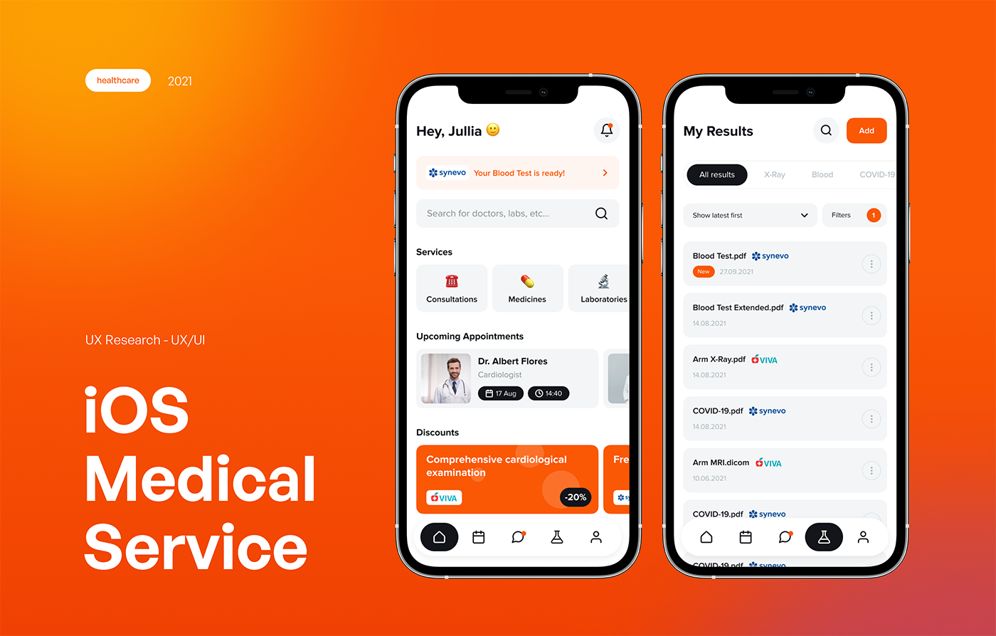 Application mobile de santé en ligne. l’utilisateur a accès à tout ce qui est nouveau en un bloc simplifié (notification pour un test prêt ; le prochain rendez-vous ; le catalogue de service etc.).